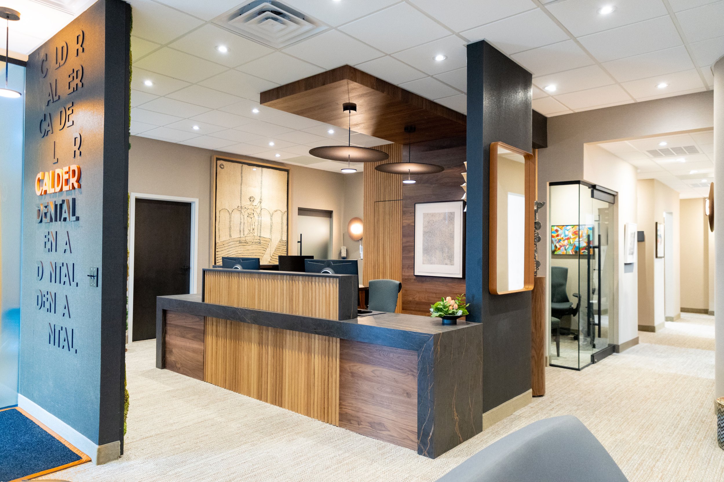 With his son’s graduation from dental school on the horizon, Dr. Calder wanted to expand and refinish his practice so he could have a legacy to live on after he was retired. Inspired by his absolute love of fine art and Mid-Century Modern Design, this office and brand came together to be a highly curated art museum and dental office combined.